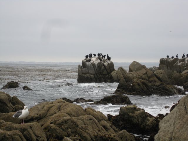 The Pacific Grove area north of Monterey also known as the Asilomar marine reserve, offers sandy paths for walkers and joggers between the road and the sea, and numerous, convenient parking areas. The accessibility to the public, the unspoiled surroundings evidenced by seaweed bestrewn beaches and teeming wildlife, including incongruously a party of 5 deer, is reminiscent of a similar stretch between Trigg and Hillary’s in Perth, Australia. How wonderful as you amble along to see nothing but the restless ocean, its fringes of rock, kelp and spray and immerse in the roar and shush of water and rock accompanied by the shriek of gulls, pelicans and cormorants. The shoreline may not be as rugged as say the Cape of Good Hope, South Africa, or the cliffs of Tintagel in Cornwall, but to my mind are just as beautiful.